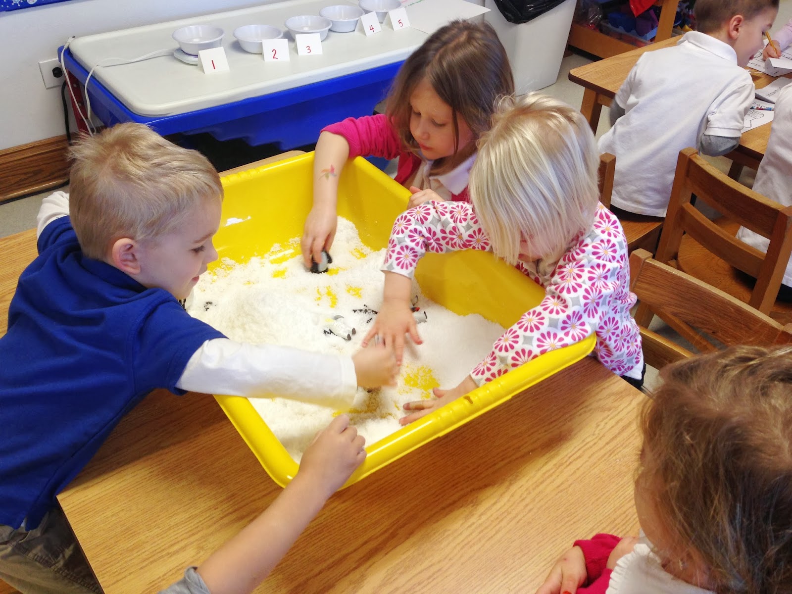 Searching for matching hearts in the sensory bin